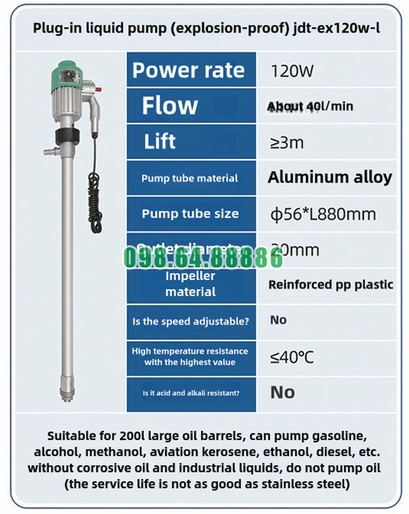 Máy bơm chất lỏng cầm tay chống cháy nổ JDT-EX120W-L đáp ứng tốt nhu cầu bơm nhanh nhờ lưu lượng mạnh, thiết kế tối ưu và vận hành đơn giản. Đây là giải pháp hiệu quả cho các công việc cần sang chiết nhanh, an toàn và ổn định, đặc biệt trong môi trường làm việc với dung môi dễ cháy.
