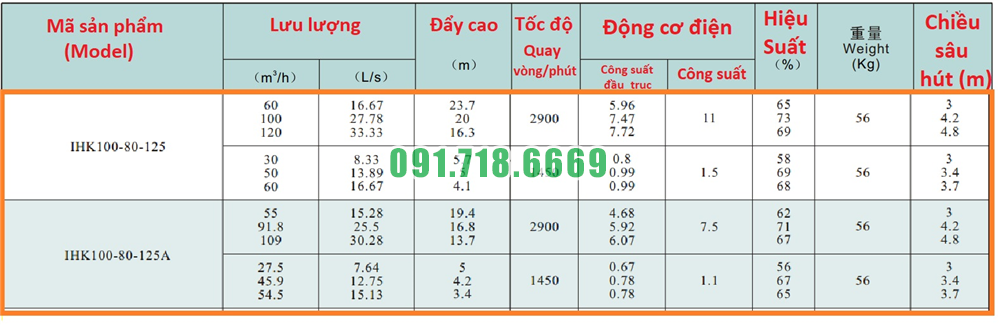 Bảng lưu lượng của bơm nước cánh hở công nghiệp model IHK100-80-125