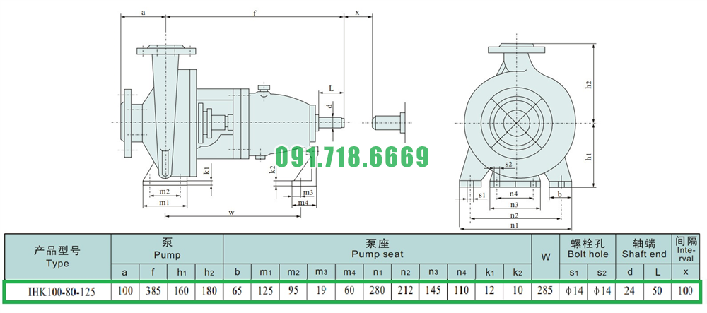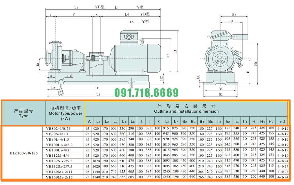 Kích thước lắp đặt của bơm nước cánh hở công nghiệp model IHK100-80-125