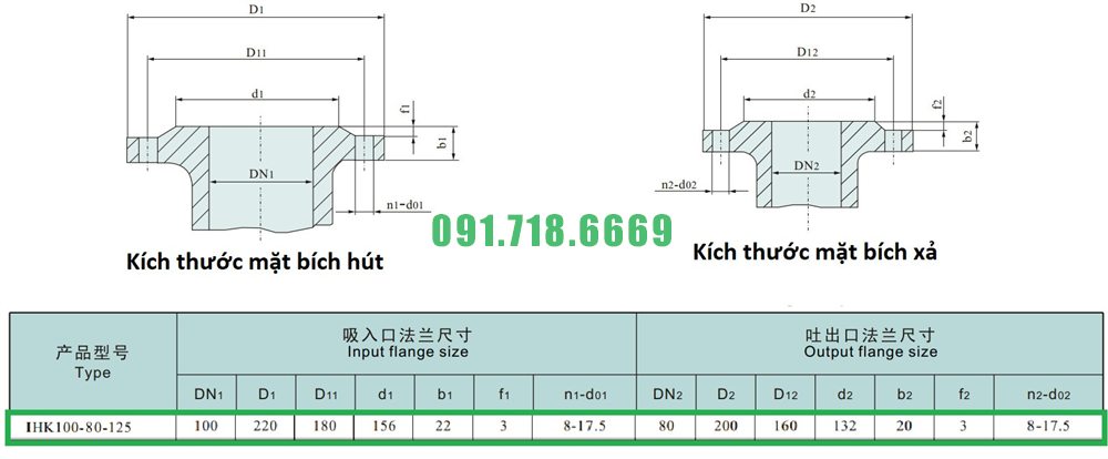 Kích thước mặt bích của bơm nước cánh hở công nghiệp model IHK100-80-125