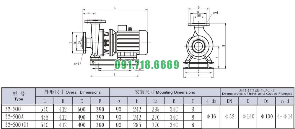 Bản vẽ cấu tạo và kích thước bơm nước trục ngang ISW32-200
