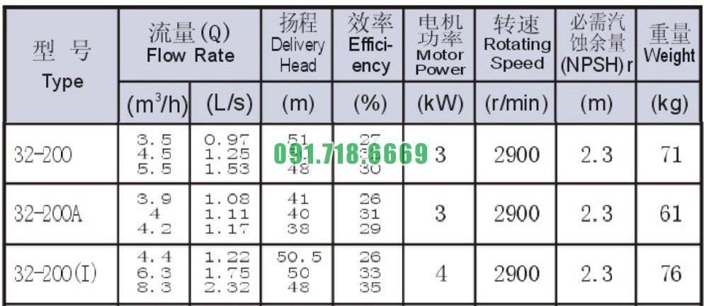 Bảng thông số kỹ thuật bơm nước trục ngang ISW32-200