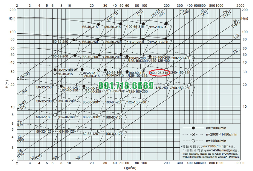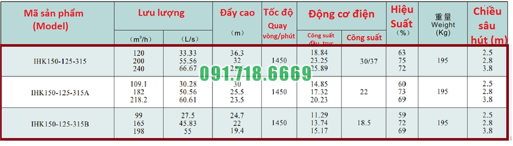 Bảng lưu lượng của máy bơm nước cánh hở IHK150-125-315 động cơ điện 37 kw