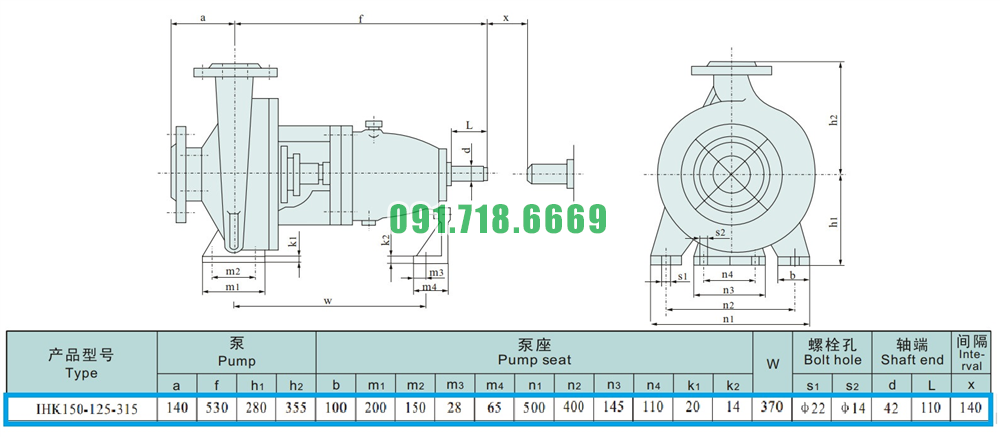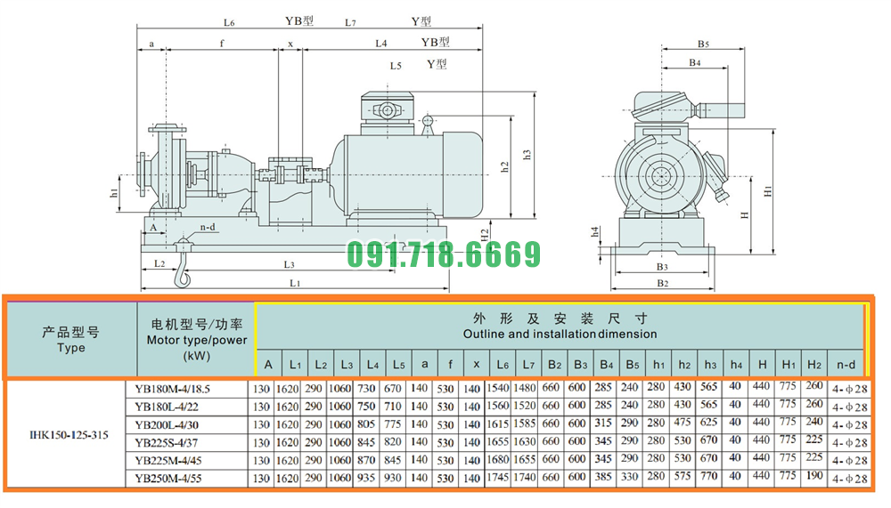 Kích thước của đầu máy bơm nước cánh hở IHK150-125-315 động cơ điện 37 kw