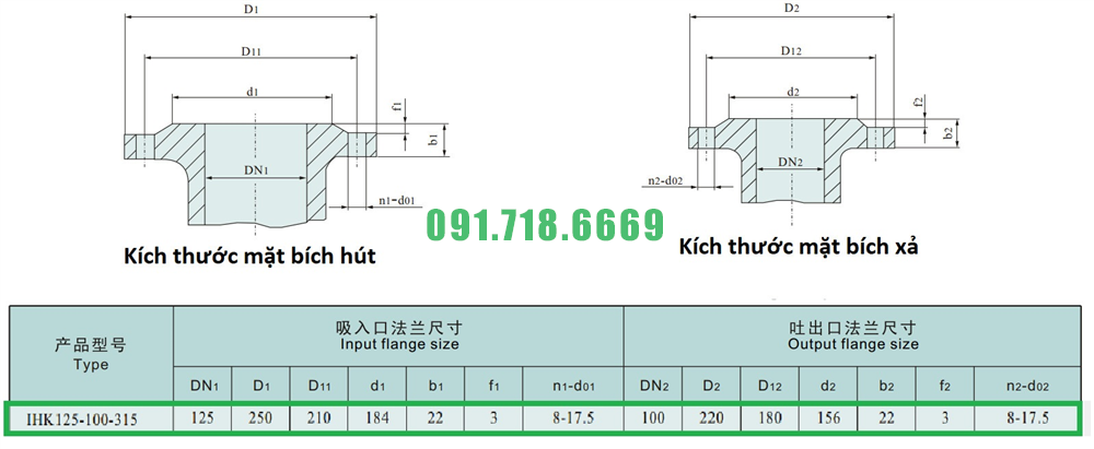 Kích thước mặt bích của máy bơm nước cánh hở IHK150-125-315 động cơ điện 37 kw