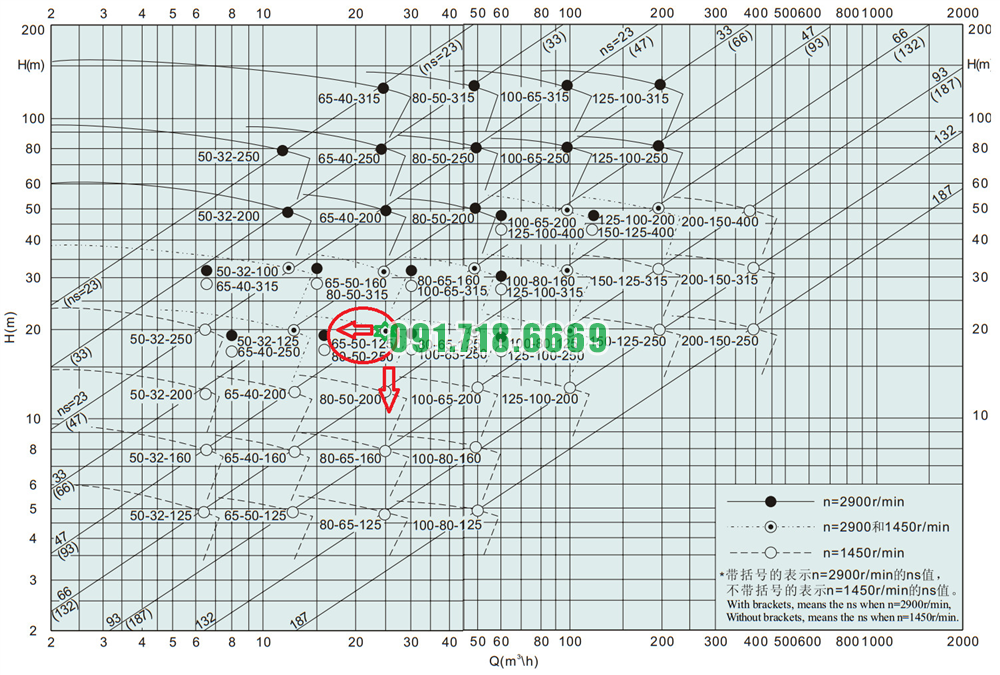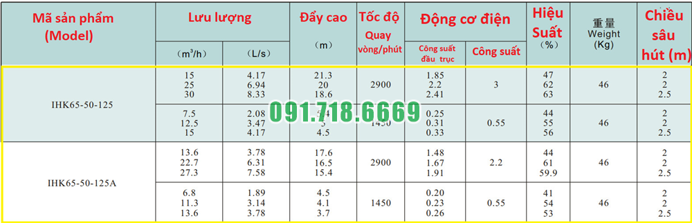 Bảng lưu lượng của máy bơm nước cánh hở IHK65-50-125 động cơ điện 3 kw