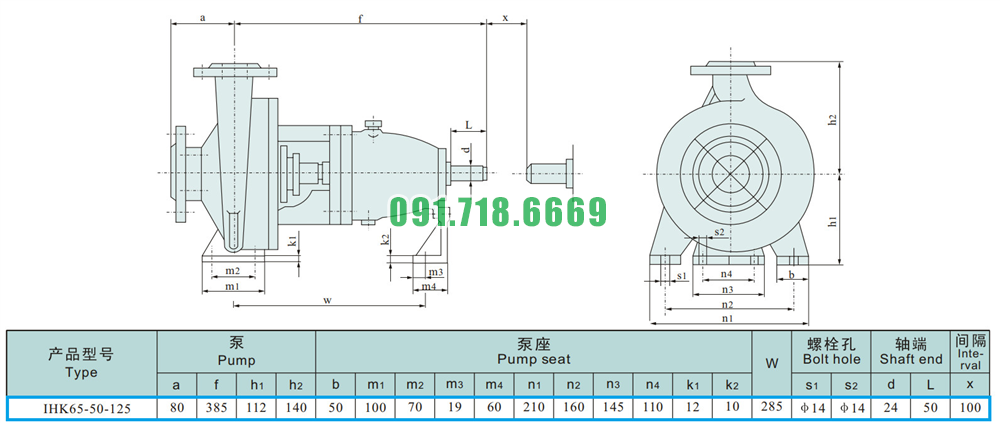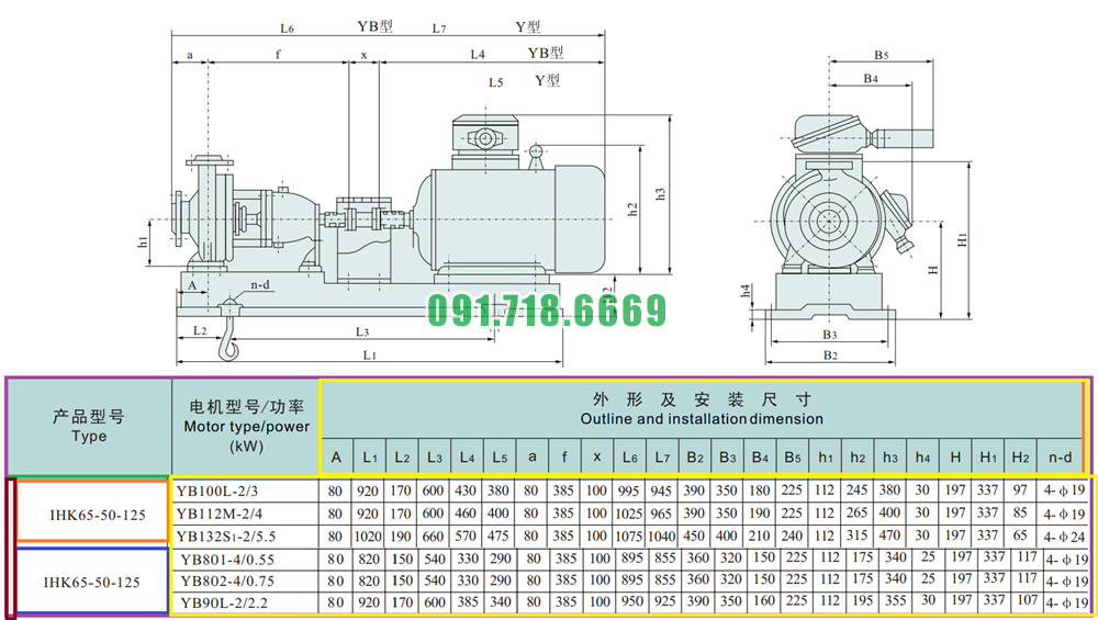 Kích thước lắp đặt của máy bơm nước cánh hở IHK65-50-125 động cơ điện 3 kw