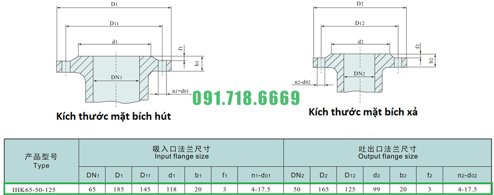 Kích thước mặt bích của máy bơm nước cánh hở IHK65-50-125 động cơ điện 3 kw