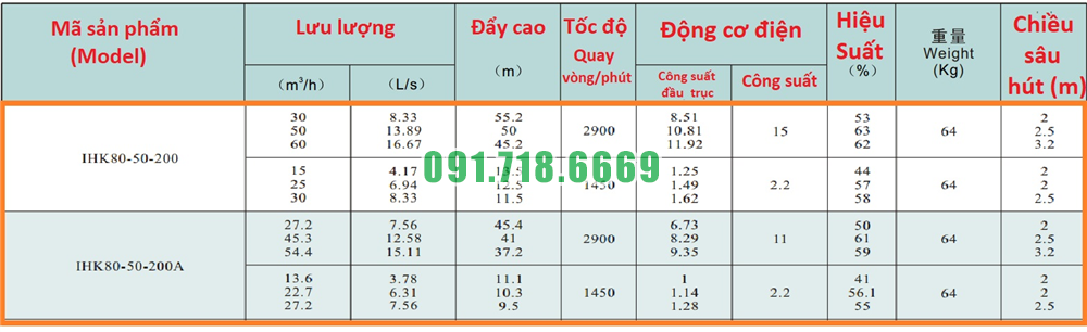 Bảng lưu lượng của máy bơm nước cánh hở IHK80-50-200 vỏ bằng inox 304
