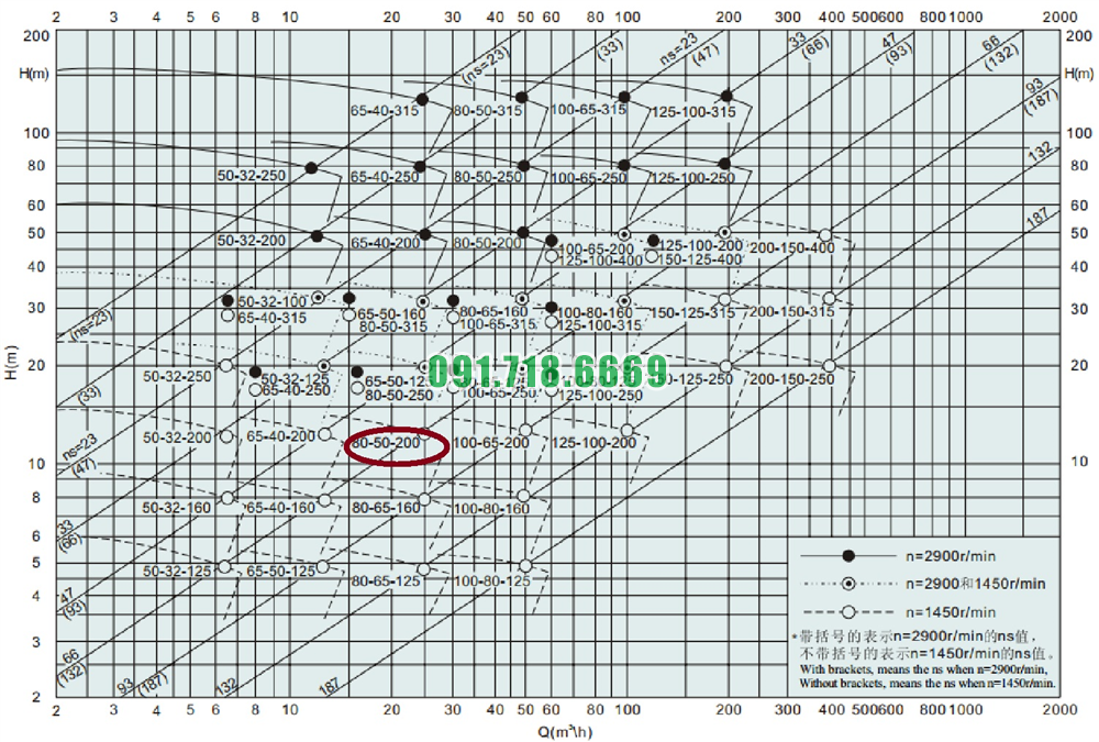 Đường cong hiệu suất của máy bơm nước cánh hở IHK80-50-200 vỏ bằng inox 304