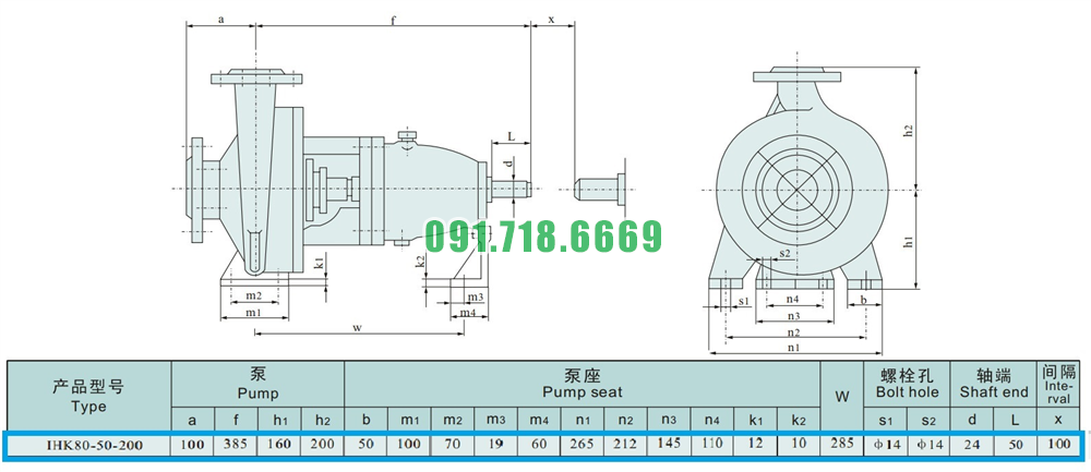 Kích thước của đầu máy bơm nước cánh hở IHK80-50-200 vỏ bằng inox 304