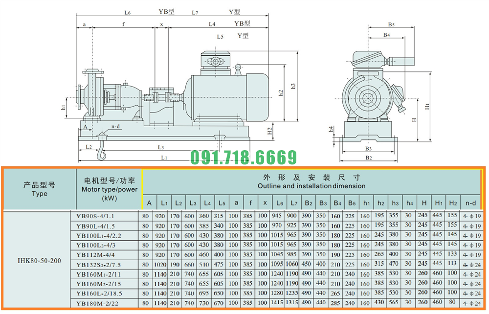 Kích thước lắp đặt của máy bơm nước cánh hở IHK80-50-200 vỏ bằng inox 304