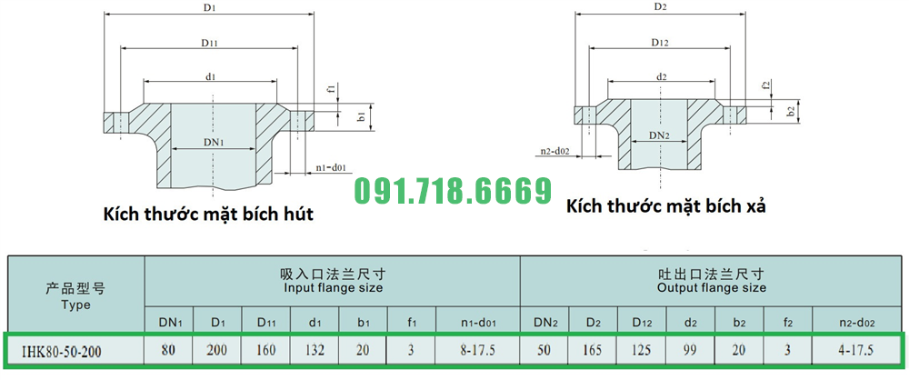 Kích thước mặt bích của máy bơm nước cánh hở IHK80-50-200 vỏ bằng inox 304