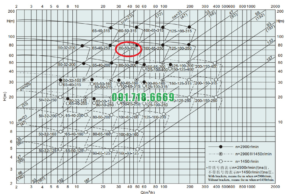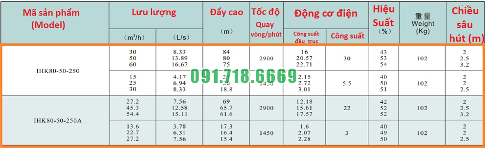 Bảng lưu lượng của máy bơm nước cánh hở IHK80-50-250 động cơ điện 30 kw