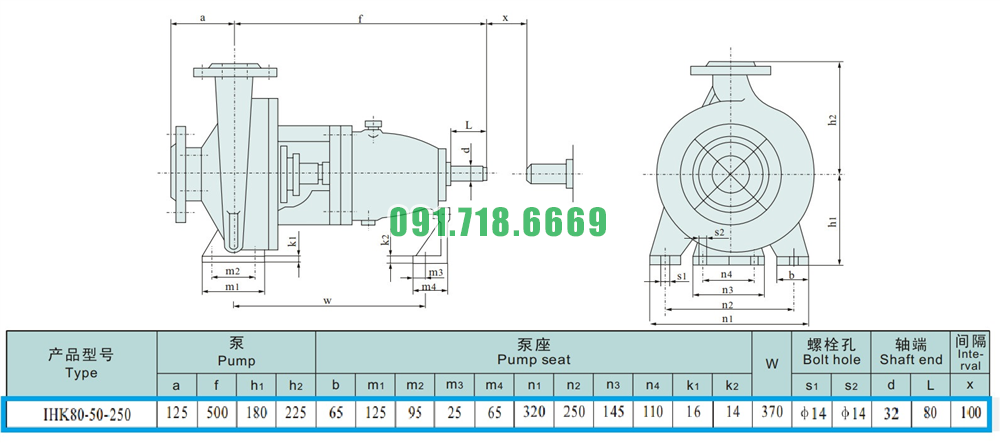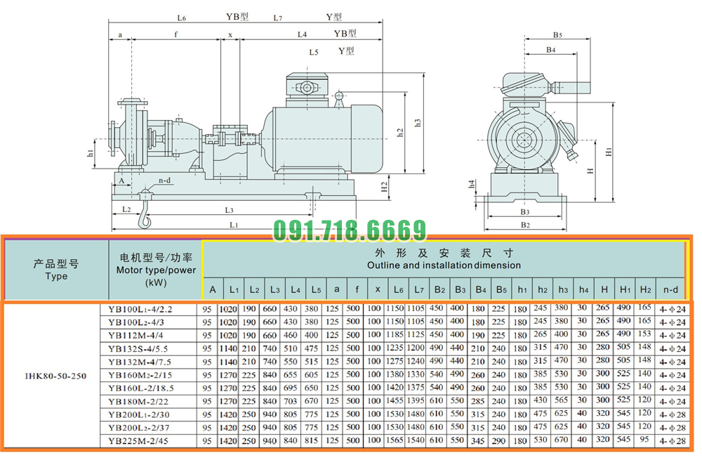 Kích thước của đầu máy bơm nước cánh hở IHK80-50-250 động cơ điện 30 kw