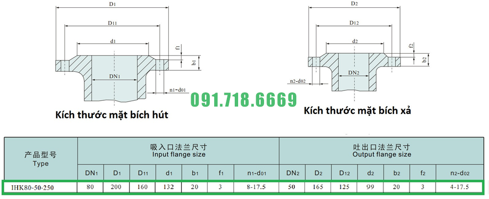 Kích thước mặt bích của máy bơm nước cánh hở IHK80-50-250 động cơ điện 30 kw