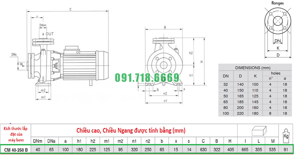 Kích thước máy bơm nước li tâm CM40-250B động cơ điện 11 kw