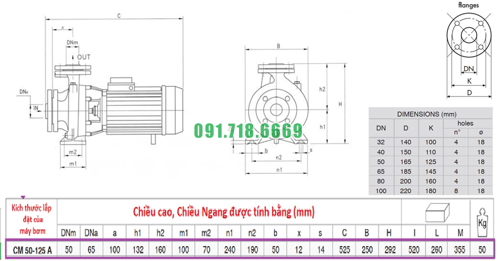 Kích thước máy bơm nước li tâm CM50-125A động cơ điện 4 kw