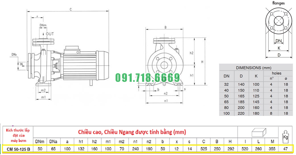 Kích thước máy bơm nước li tâm CM50-125B động cơ điện 3 kw