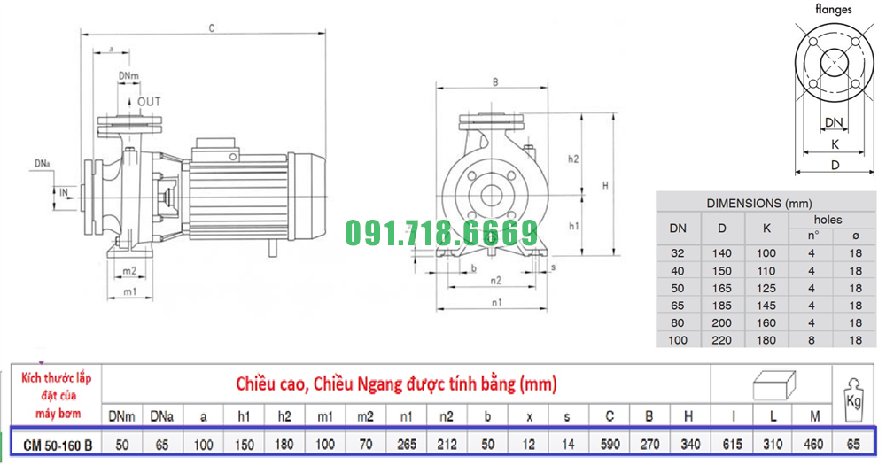 Thông số kỹ thuật máy bơm nước li tâm CM50-160B kích thước 40 mm