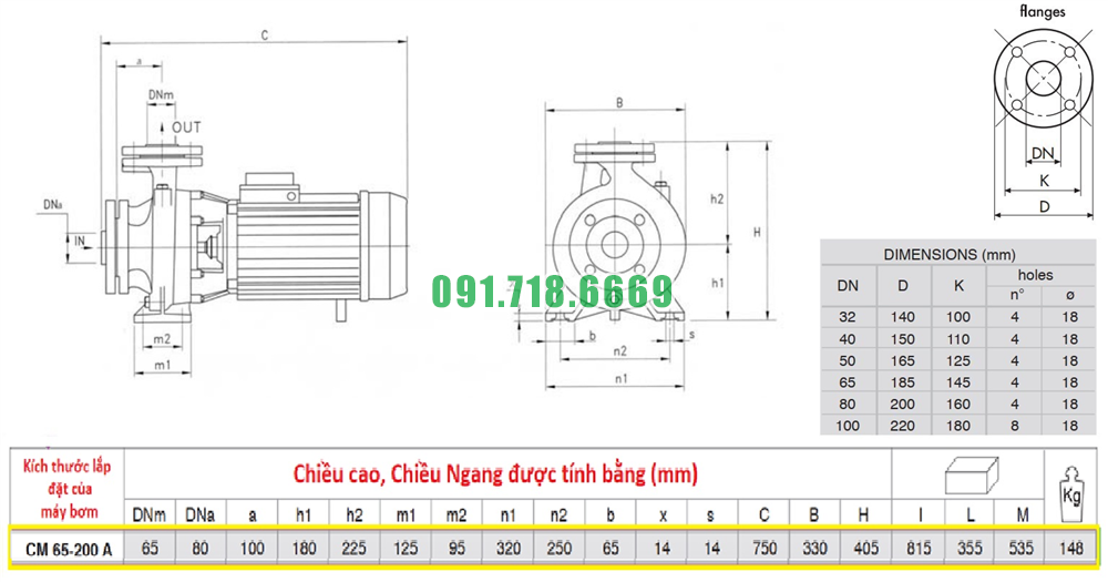 Kích thước máy bơm nước li tâm CM65-200A động cơ điện 22 kw
