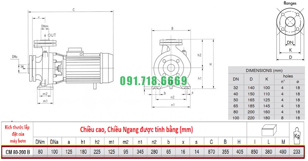 Kích thước máy bơm nước li tâm CM80-200B động cơ điện 30 kw