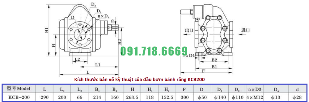 Bản vẽ kỹ thuật của bơm bánh răng KCB200 lưu lượng 12 m3