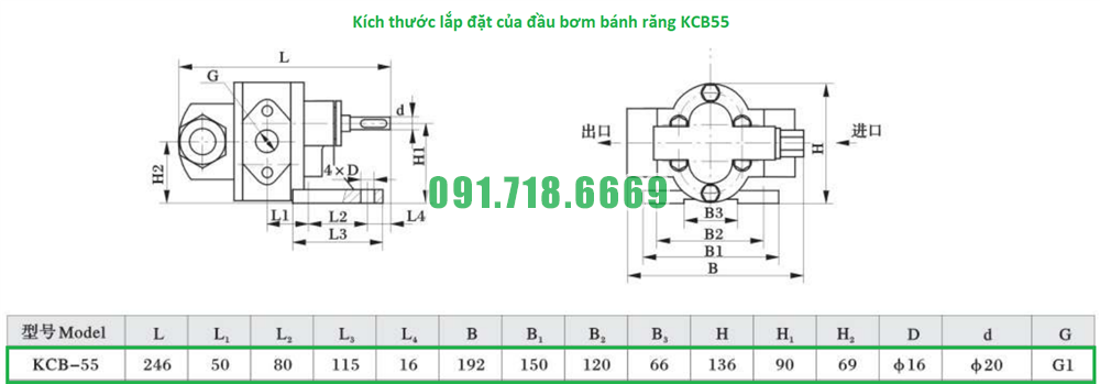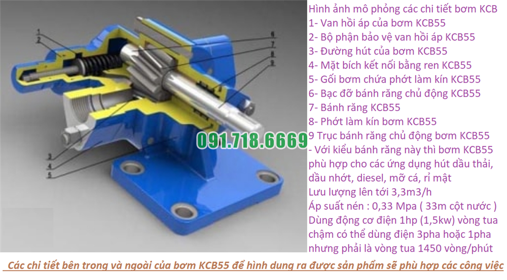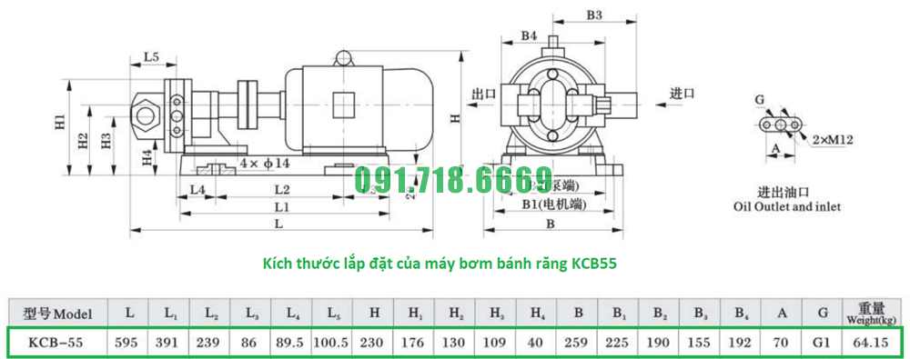 Bảng thông số kỹ thuật của bơm bánh răng KCB55 vật liệu gang