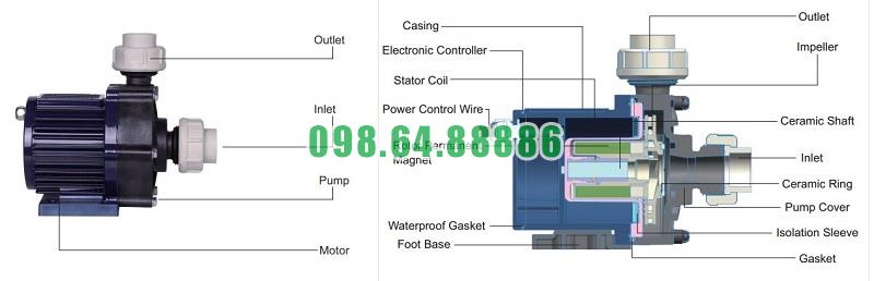 - Thiết kế theo kiểu dẫn động từ (magnetic drive), không sử dụng phớt cơ khí, giúp tránh rò rỉ hóa chất.