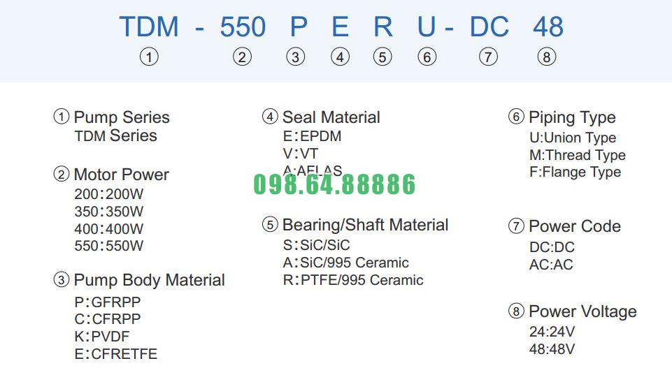 Bảng thông số kỹ thuật bơm hóa chất điện áp 24v và 48v TDM-200PERU-DC48