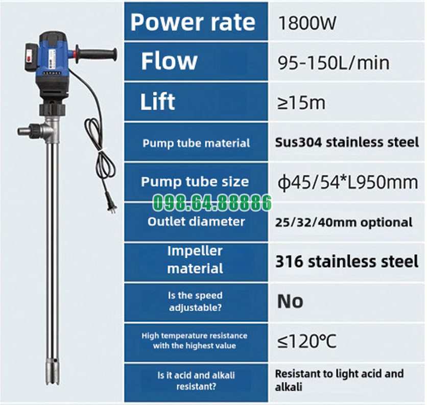 Vật liệu inox cao cấp của Bơm thùng phuy nhiệt độ cao JDT-1800W-G120