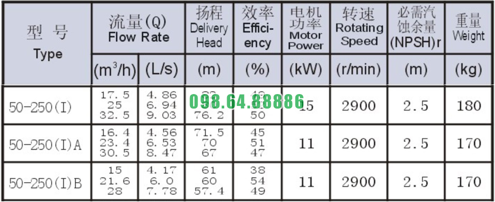 Bảng thông số kỹ thuật bơm li tâm trục ngang mã SLW-ISW50-250-I lưu lượng 28.3 m3/h