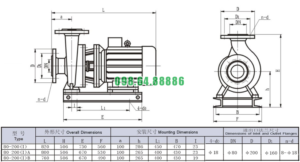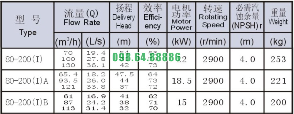 Bảng thông số kỹ thuật bơm li tâm trục ngang mode SLW80-ISW80-200-I
