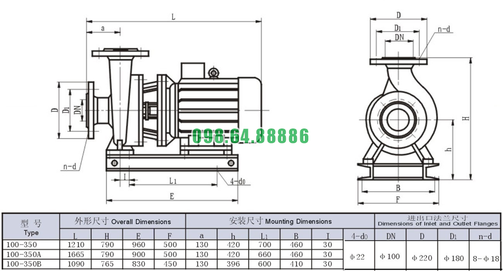 Bản vẽ cấu tạo và kích thước bơm li tâm trục ngang model SLW100-ISW100-350 công suất 33.3 L/s