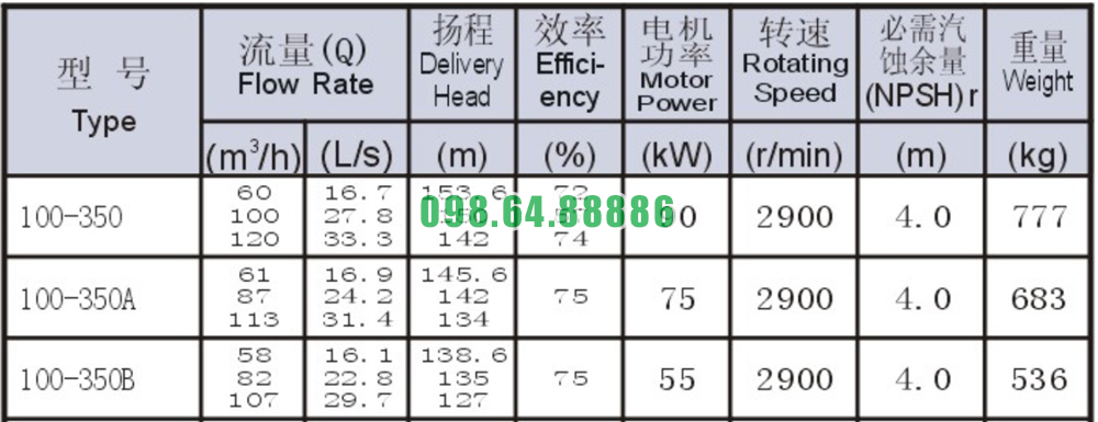 Bảng thông số kỹ thuật bơm li tâm trục ngang model SLW100-ISW100-350 công suất 33.3 L/s