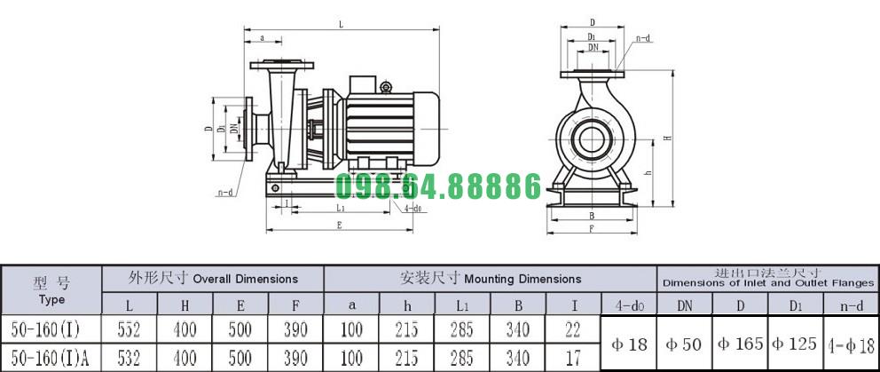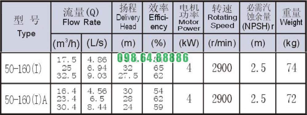 Bảng thông số kỹ thuật bơm nước li tâm trục ngang hút sâu 2.5m model SLW-ISW50-160-I