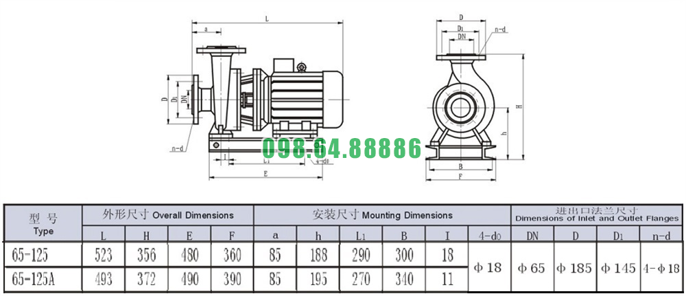 Bản vẽ cấu tạo và kích thước bơm nước li tâm trục ngang mode SLW-ISW65-125 động cơ 3 kw công suất 9.03 L/s