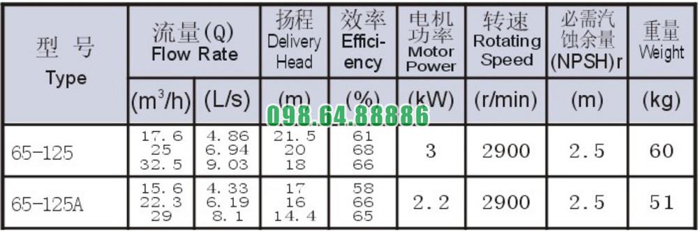 Bảng thông số kỹ thuật bơm nước li tâm trục ngang mode SLW-ISW65-125 động cơ 3 kw công suất 9.03 L/s