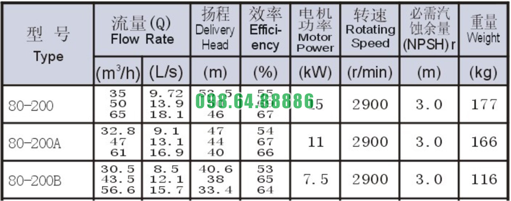 Bảng thông số kỹ thuật bơm nước li tâm trục ngang mode SLW80-ISW80-200 động cơ 15 kw công suất 18.1 L/s