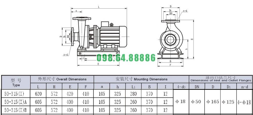 Bản vẽ cấu tạo và kích thước bơm nước li tâm trục ngang model SLW-ISW50-315-I lưu lượng từ 17.5 m3/h - 32.5 m3/h