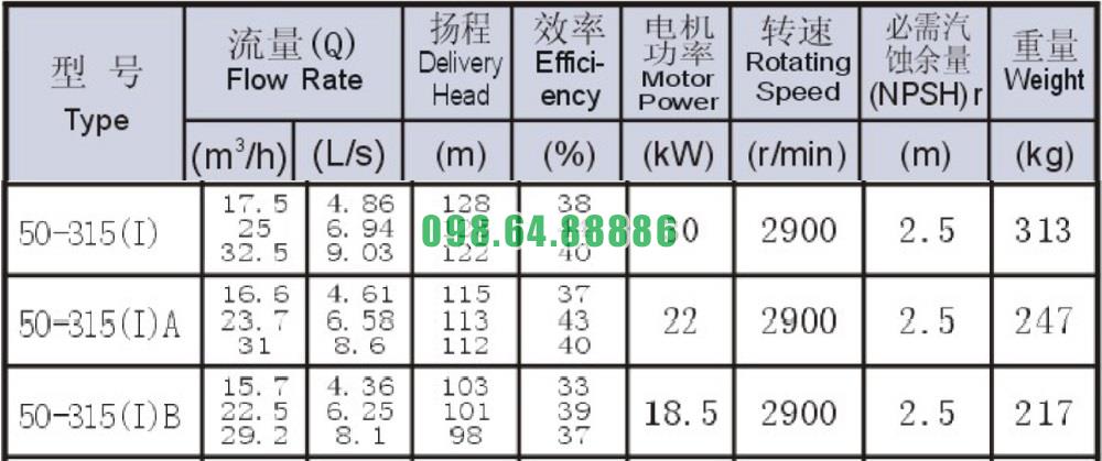 Bảng thông số kỹ thuật bơm nước li tâm trục ngang model SLW-ISW50-315-I lưu lượng từ 17.5 m3/h - 32.5 m3/h