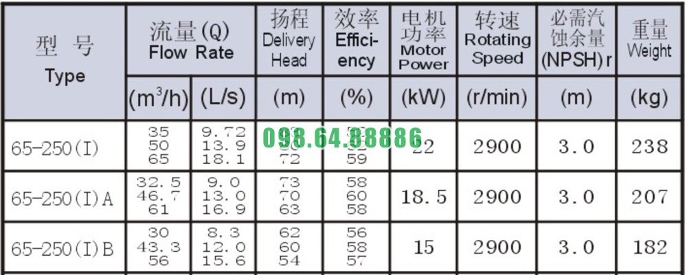 Bảng thông số kỹ thuật bơm nước li tâm trục ngang model SLW65-ISW65-250-I lưu lượng từ 35 m3/h - 65 m3/h