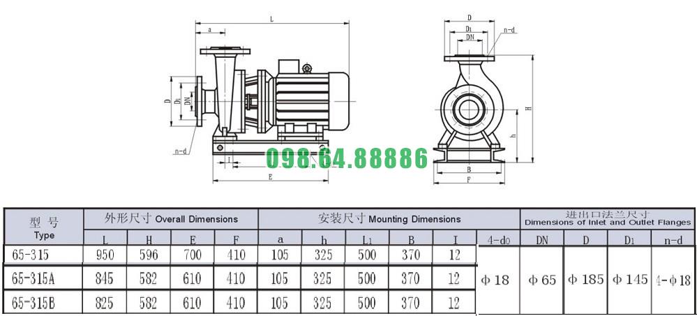 Bơm nước li tâm trục ngang model SLW65-ISW65-315 lưu lượng từ 17.5 m3/h - 32.5 m3/h