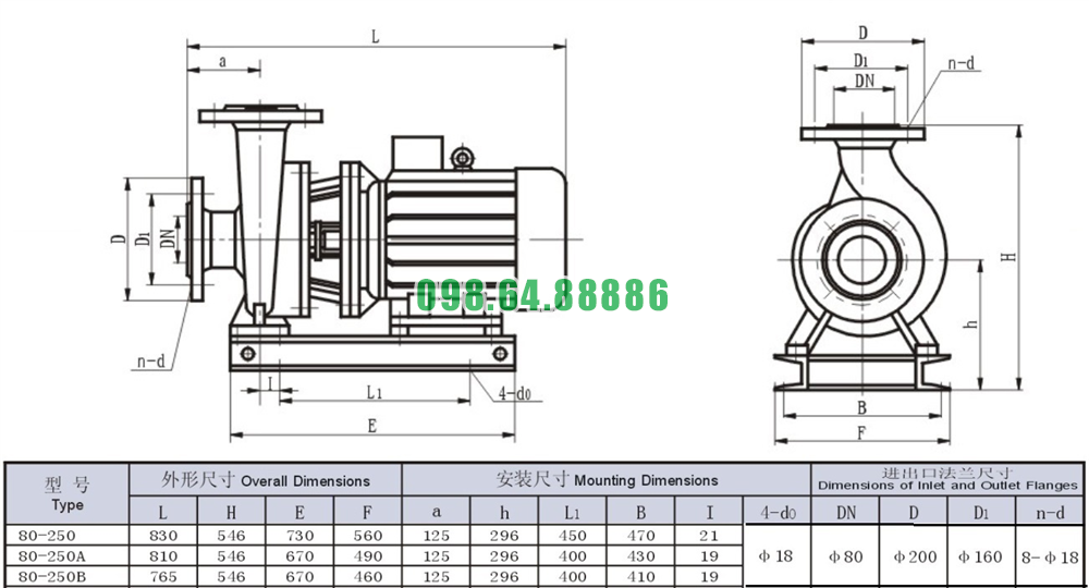 Bản vẽ cấu tạo và kích thước bơm nước li tâm trục ngang model SLW80-ISW80-250 lưu lượng từ 35 m3/h - 65 m3/h