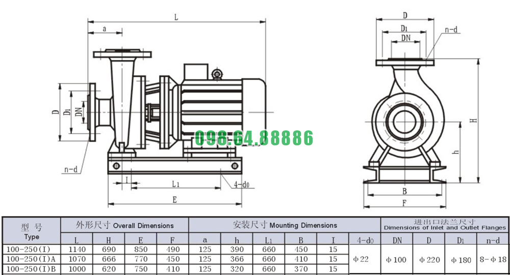 Bản vẽ cấu tạo và kích thước bơm nước li tâm trục ngang mode SLW100-ISW100-250-I động cơ 55 kw công suất 53.3 L/s