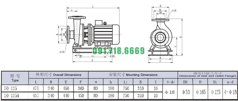 Bản vẽ cấu tạo và kích thước bơm nước li tâm trục ngang SLW-ISW50-125 động cơ 1.5 kw lưu lượng max 16.3 m3/h