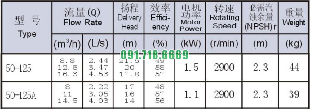 Bảng thông số kỹ thuật bơm nước li tâm trục ngang SLW-ISW50-125 động cơ 1.5 kw lưu lượng max 16.3 m3/h