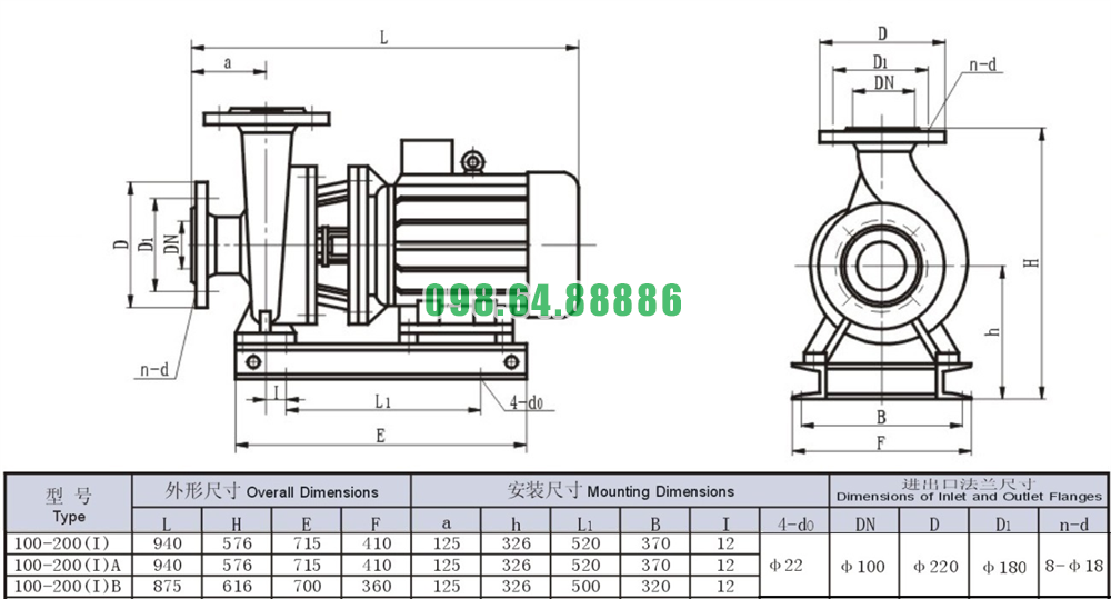 Bản vẽ cấu tạo và kích thước bơm nước li tâm trục ngang SLW100-ISW100-200-I động cơ 37 kw lưu lượng max 192 m3/h
