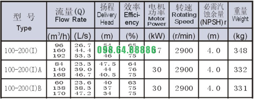 Bảng thông số kỹ thuật bơm nước li tâm trục ngang SLW100-ISW100-200-I độn