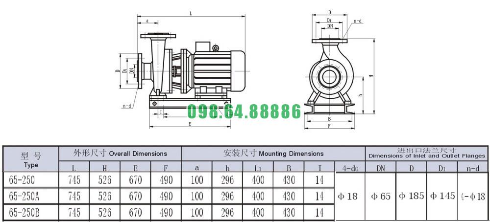 Bản vẽ cấu tạo và kích thước bơm nước li tâm trục ngang SLW65-ISW65-250 động cơ 15 kw lưu lượng max 32.5 m3/h